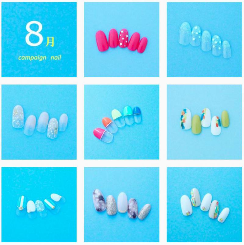 8月キャンペーンネイルのお知らせです。 フランキンセンスネイルでは毎月デザインが変わるキャンペーンネイルがございます♪ 一番上の段 2種類より選択の¥5,900 二番目の段 3種類より選択の¥7,900 三番目の段 3種類より選択の¥8,900 の3コース、計8種類がございます! 季節ごとのネイルアートをお楽しみに♪