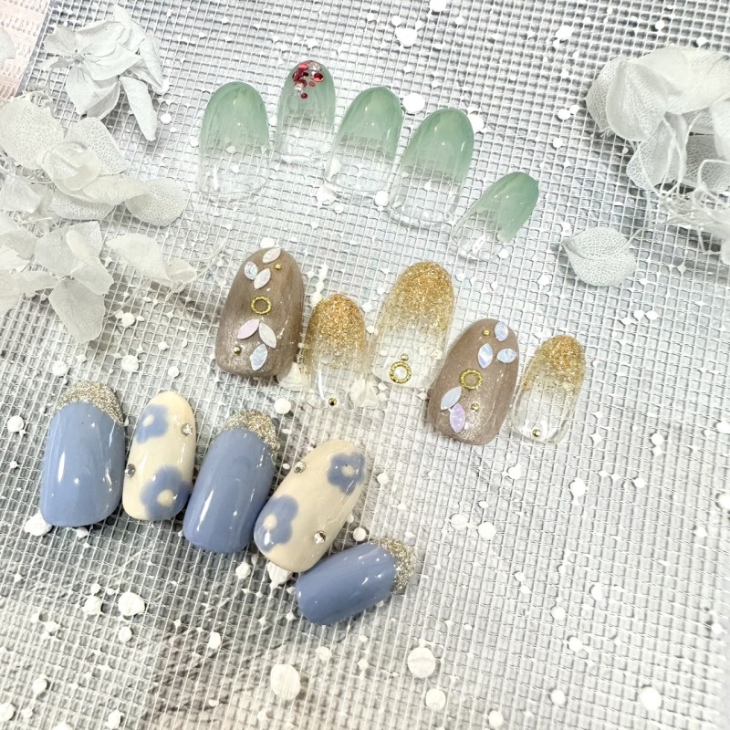 5月は存在感あるうるうるのホログラムの輝きがかわいい!カジュアルにも色味を変えて大人っぽくもするのもおすすめ♪ ホログラムのオーロラ感が手元をより綺麗に見せてくれるデザイン♪ ラメグラの輝きでより華やかに! さらに大きめの花柄とラメフレンチを組み合わせでまとまりのあるデザインに⭐ 淡めのカラーでも濃いめのカラーでも相性ばっちりです♪
