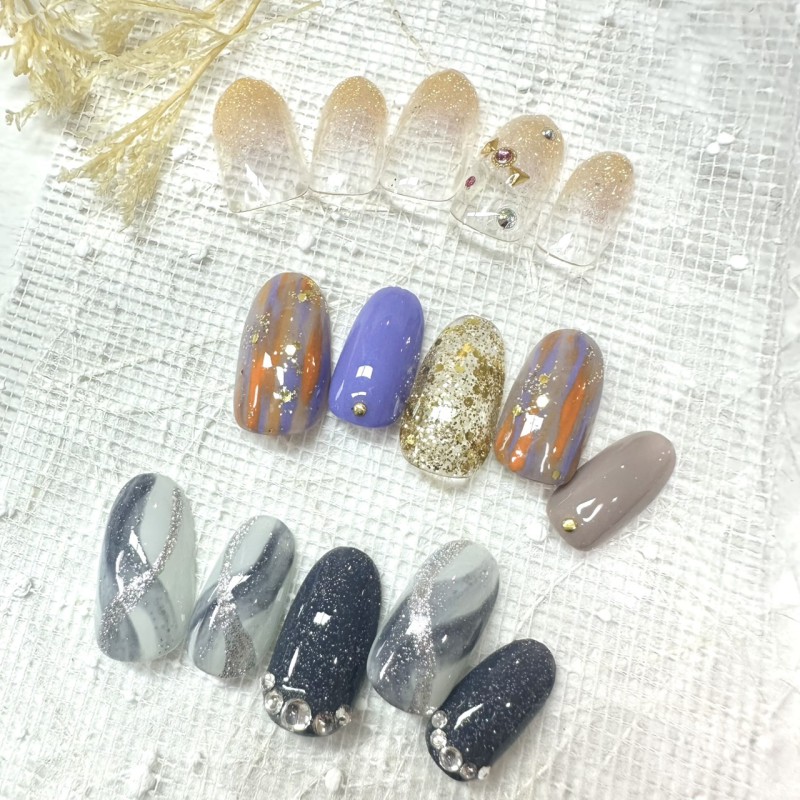 キャンディーのような可愛らしいストーンがポイント♡ 透明感あふれるキラキラのラメグラデーションと相性抜群で、指先を華やかに演出します。 ハロウィン気分を楽しめるカラーリングで、爪先から季節感を先取り⭐ カラーの組み合わせ次第で、ポップにもシックにもアレンジ可能です♪ 流れるようなラインアートは、手元をすっきり綺麗に見せてくれる優秀デザイン。 大人っぽさの中に可愛らしさもある、秋にぴったりの上品ネイルです!